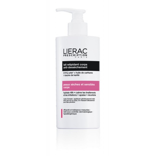 Lierac Prescription Leite Relipidante Corpo Anti-Dessèchement é um leite hidratante para o corpo especialmente indicado para pele sensível seca e muito seca. Este cuidado possui uma ação que hidrata em profundidade e durante 48h, evitando o ressecamento e a desidratação da pele. A sua textura fundente, não colante e de rápida absorção, nutre e suaviza a pele, proporcionando uma sensação de conforto imediato e diminuindo as sensações de repuxar e pele irritada. Hipoalergénico. Não comedogénico. Sem parabenos. Sem corantes sintéticos. Sem perfume. A gama Lierac Prescription foi especialmente formulada para peles sensíveis e intolerantes, pelo que contém o mínimo de constituintes e componentes biomiméticos (componentes naturalmente presentes na pele ou com funcionamento biológico idêntico) de forma a minimizar a probabilidade da ocorrência de episódio alérgico cutâneo.